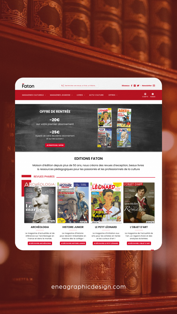 Optimisation de l’arborescence, harmonisation de l’univers graphique de Faton, zones repensées pour le header (en-tête) & le footer (pied de page), pages redéfinies de façon ergonomique favorisant la conversion…